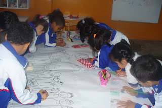 llegamos al aula y encontramos en la mesa papelotes donde están dibujadas las aulas que hemos visitado y hay figuras de los niños que hay en cada una de ellas . En grupo relacionan por el color y la forma , pegan y ordenan en el papelote , los niños , sus aulas ,sus maestras su profesora, su auxiliar, don Santiago, la secretaría la Directora, etc.